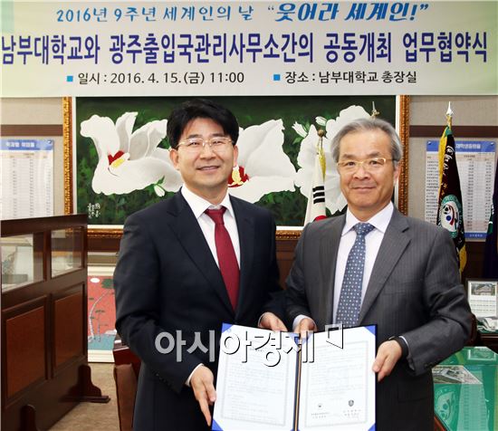 남부대학교 조성수 총장(오른쪽)은 15일 오전 11시 교내 총장실에서 광주출입국관리사무소 김상진 소장과 9주년 세계인의 날 ‘웃어라 세계인’기념행사 공동개최 업무협약을 체결했다.<br />