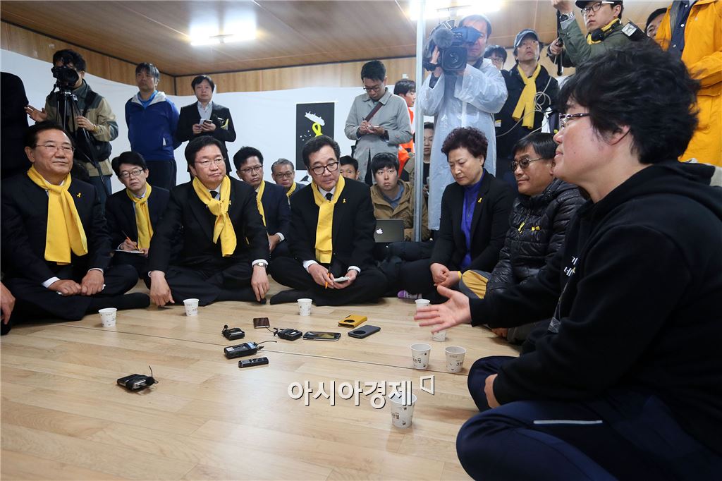 세월호 사고 2주기 추모행사가 16일 진도 팽목항에서 열린 가운데 김영석 해양수산부 장관, 이낙연 전남지사가 미수습자 가족들과 대화하고 있다. 희생자 가족과 종교인, 주민 등 2,500여명이 참석했다. 사진제공=전남도<br />