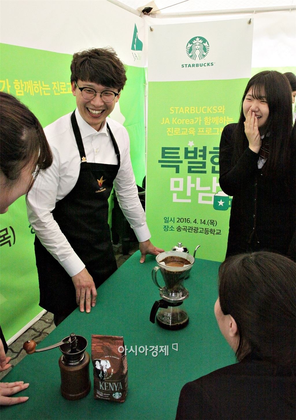 [아시아경제 오주연 기자] 스타벅스커피 코리아가 작년에 이어 올해에도 교육기부 국제 NGO인 JA(Junior Achievement)와 함께 진행하는 청소년 진로 교육 프로그램을 전개한다고 17일 밝혔다. 이를 위해 바리스타 재능기부 봉사활동과 함께 5만달러(약 55백만원)의 스타벅스 재단 기금을 협력 NGO인 JA 코리아에 전달해 교육 교재 제작과 프로그램 운영을 함께 지원한다. 첫 번째 활동으로 이달 15일 스타벅스커피 코리아 백수정 마케팅 담당 임원이 서울 중랑구에 위치한 송곡관광고등학교를 방문해 전교 학생 540 명에게 '스타벅스 경험과 바리스타 직업 소개'를 주제로 기업 활동과 업무 경험을 공유하는 강의를 진행했다.이어서 40여명의 스타벅스 바리스타와 임직원들이 참여해 운동장에서 3학년 학생 180명을 대상으로 잡 페어 행사를 개최했다. 이 날 행사에서는 일반적인 면접 기술을 배우는 면접 체험, 직접 작성해 본 이력서 1:1 첨삭지도, 이력서 사진 촬영을 통해 실제 구직 활동에 필요한 교육을 진행했다. 이밖에 바리스타 직업 소개 및 채용 상담, 커피 세미나, 장래 희망 응원 이벤트 등 구직 활동에 영감을 줄 수 있는 다양한 활동을 통해 학생들의 진로 설계를 도왔다.스타벅스는 올해 11월까지 서울, 부산, 대구 등 전국 주요 도시 소재의 일반 및 특성화 고등학교의 신청을 받아 스타벅스 임직원들이 멘토로 나서서 학생들의 사회 진출을 돕는 진로 교육을 진행할 예정이다. 진로교육 프로그램은 학생들이 졸업 후 성공적인 사회생활을 이어나갈 수 있도록 이력서 작성, 발표 기술, 모의 면접, 직업의 이해, 관계 형성 기술, 갈등 해결 기술 등의 이론과 실습 과정으로 구성돼 있다. 이석구 스타벅스커피 코리아 대표이사는 "스타벅스는 앞으로도 세계적인 NGO인 JA와 함께 우리 미래 세대 주역인 청소년들의 취업에 실질적인 도움을 제공하고, 이들이 건강한 사회구성원으로 성장할 수 있도록 다양한 재능기부 활동을 전개해 나갈 예정"이라고 밝혔다.JA는 1919년 미국에서 설립되어 UN 경제사회이사회로부터 특정분야 협의지위를 받은 단체이다. 매년 전세계에서 120여개국에서 40만여명의 JA 자원봉사자들이 1000만명 이상의 학생들에게 무료로 시장경제와 직업을 교육하는 재능기부 활동에 참여하고 있다. 스타벅스는 한국과 미국, 홍콩에서 JA와 함께 활동을 전개하고 있다. 오주연 기자 moon170@asiae.co.kr<ⓒ세계를 보는 창 경제를 보는 눈, 아시아경제(www.asiae.co.kr) 무단전재 배포금지>