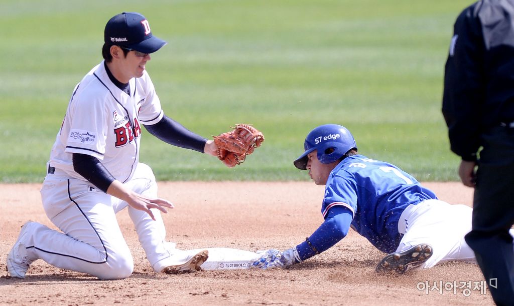 [잠실=아시아경제 김현민 기자] 프로야구 삼성 라이온즈와 두산 베어스의 2016 KBO리그 경기가 17일 잠실구장에서 열렸다. 3회초 2사 1루에서 삼성 배영섭 타석 때 1루주자 김상수가 2루 도루에 성공하고 있다. 두산 유격수는 김재호.김현민 기자 kimhyun81@asiae.co.kr<ⓒ세계를 보는 창 경제를 보는 눈, 아시아경제(www.asiae.co.kr) 무단전재 배포금지>