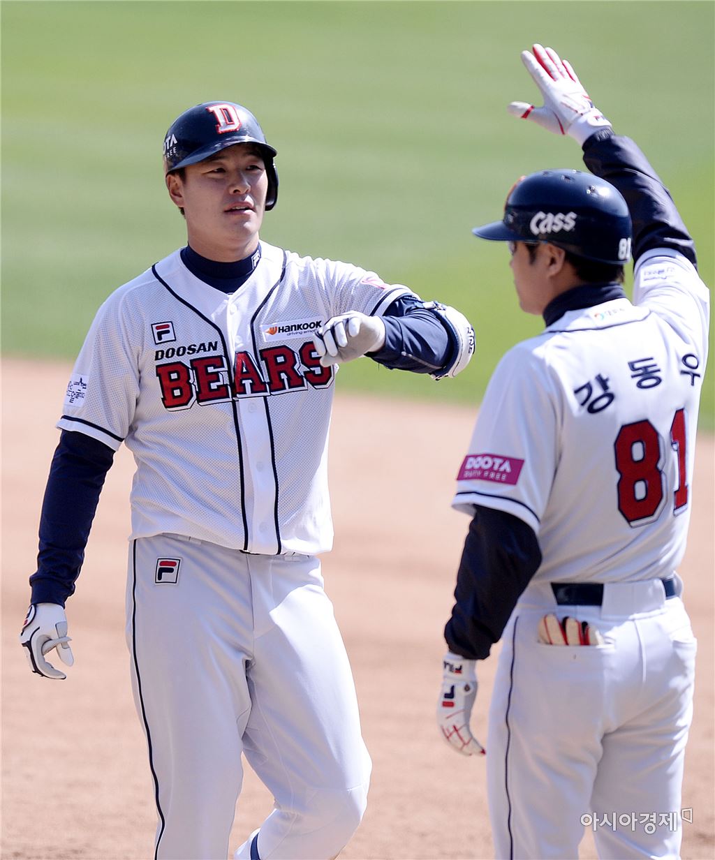 [잠실=아시아경제 김현민 기자] 프로야구 삼성 라이온즈와 두산 베어스의 2016 KBO리그 경기가 17일 잠실구장에서 열렸다. 3회말 1사 1루에서 두산 민병헌이 좌전 안타를 치고 강동우 코치와 하이파이브하고 있다 .김현민 기자 kimhyun81@asiae.co.kr<ⓒ세계를 보는 창 경제를 보는 눈, 아시아경제(www.asiae.co.kr) 무단전재 배포금지>