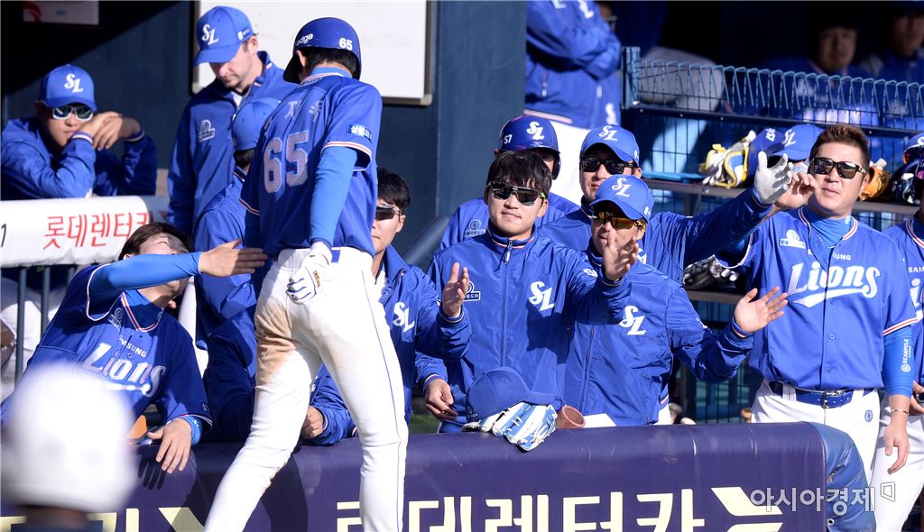[잠실=아시아경제 김현민 기자] 프로야구 삼성 라이온즈와 두산 베어스의 2016 KBO리그 경기가 17일 잠실구장에서 열렸다. 9회초 무사 2,3루에서 삼성 발디리스의 중견수 희생플라이 때 3루주자 구자욱이 득점한 뒤 동료들의 환영을 받고 있다.김현민 기자 kimhyun81@asiae.co.kr<ⓒ세계를 보는 창 경제를 보는 눈, 아시아경제(www.asiae.co.kr) 무단전재 배포금지>