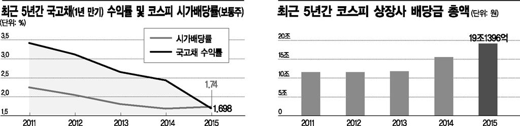 시가배당률 1.74%, 수익률 0.4%p 앞서기업들 배당규모 확대·금리하락 효과실적부진한 오너들 배불리기 비판도[아시아경제 최동현 기자] 코스피 상장사들의 평균 시가배당률이 사상 처음으로 국고채(이하 1년 만기 기준) 수익률을 앞질렀다. 기업들의 배당규모 확대와 시중금리 하락 추세 등이 맞물린 결과로 앞으로 배당 투자의 매력이 더욱 부각될 것이라는 분석이다. 18일 한국거래소가 12월 결산법인 코스피 상장사들의 현금배당 공시현황(지난해 말 기준)을 분석한 결과, 이들의 보통주 평균 시가배당률은 1.74%로 집계됐다. 지난해 말 국고채 평균 수익률 1.698%보다 0.4%포인트 이상 높은 수치다. 상장사들의 시가배당률이 높았던 2011년엔 2.25%까지 올라가기도 했지만 당시는 국고채 평균 수익률은 3.42%였다. 시가배당률이란 배당금이 배당기준일 주가의 몇 %인지 나타내는 비율로 주로 시중 금리나 채권 수익률 등과 비교할 때 사용된다. 저금리 기조로 국고채 금리는 꾸준히 하락했으나 배당소득 증대세제와 기업소득 환류세제 등 정부 정책과 주주들의 요구로 기업들이 배당을 확대하면서 시가배당률과 국고채의 사상 첫 역전현상이 일어났다. 코스피 상장사들의 배당금 총액 규모는 2011년 11조6017억원에서 지난해 19조1396억원까지 불었다. 특히 2013부터 3년 연속 증가 추세에 있으며 코스피 상장사 중 배당을 실시한 법인도 63.4%에서 66.8%까지 점차 비중이 확대되고 있다. 올해만 놓고 보면 전체 상장사 737곳 중 492곳(66.8%)이 현금배당을 실시했고, 이들 가운데 199곳(40.4%)의 시가배당률이 국고채 수익률을 앞섰다. 또 매년 현금배당을 공시한 법인의 약 90%가 2년 이상 연속으로 배당을 실시했고, 이 중 94%는 다음해에도 연속으로 배당을 추진했다. 특히 전체 현금배당 법인 492곳 중 355곳(72.2%)이 5년 연속 현금배당을 실시했다. 거래소 관계자는 "연속 배당법인이 많다는 것은 그만큼 주주가치 제고를 위해 안정적인 배당정책을 유지하려고 노력한다는 것"이라며 "장기간 연속으로 배당을 실시한 기업의 다음해 배당유무 정책에 대한 예측가능성도 높은 것으로 확인됐다"고 평가했다. 5년 연속으로 국고채 수익률을 초과한 법인은 총 30곳이었다. 이 중 섬유제품 생산업체 일정실업의 최근 5년간 평균 시가배당률이 6.52%로 가장 높았다. 일정실업은 올해 보통주 1주당 1250원(시가배당률 4.3%)으로 총 15억원 규모의 현금배당을 실시했다. 이어 아주캐피탈(6.03%), 진양산업(6.02%), 한국쉘석유(5.10%) 등의 순이었다. 다만 일각에서는 실적이 부진한 기업들이 무리한 고배당에 나선 것과 관련해 오너 일가의 지갑만 두둑히 불려주는 게 아니냐는 비판도 있다. 일정실업의 경우 지난해 영업이익은 36억원으로 전년 동기 대비 29.71% 줄었다. 지속된 재정악화로 지난해 안산시 일대 제 2공장과 토지 등도 처분했다. 현재 일정실업의 최대주주 및 특수관계인인 고희석 회장 일가가 보유한 지분은 62.49%에 달한다. 업종별로는 통신업(3.42%)과 종이목재업(2.93%), 전기가스업(2.92%)의 최근 5년 평균 시가배당률이 3% 내외로 평균 국고채 수익률을 초과해 업종 상위를 차지했다. 반면 음식료품(1.26%), 의료정밀(1.30%), 유통업(1.30%) 등의 순으로 시가배당률이 낮았다. 전문가들은 앞으로 기업들의 배당성향이 더욱 늘어날 것으로 예상했다. 오온수 현대증권 연구원은 "금융당국의 배당확대 정책이 지속되고 있고 기업들도 배당에 전향적인 자세가 나타나고 있다"며 "올해 기준 배당수익률도 1.74% 수준까지 상승할 것"이라고 말했다. 김용구 하나금융투자 연구원도 "올해 20대 총선에서 원내 1당으로 부상한 더불어민주당이 사내유보금 과세제도의 전면 개편 의지를 밝혔고 고배당을 요구하는 연기금의 의결권 행사 강화를 정책 실행 계획으로 명시했다"며 "앞으로 배당투자 활성화에 있어 새로운 전기가 마련될 것"이라고 기대했다. 한편 현금배당을 실시한 상장사들의 평균 주가상승률은 코스피 상승률을 최근 5년간 지속적으로 초과했다. 특히 지난해엔 코스피 대비 주가가 평균 26.2%p 높게 올라 최근 5년 중 최고 수준을 기록했다.최동현 기자 nell@asiae.co.kr<ⓒ세계를 보는 창 경제를 보는 눈, 아시아경제(www.asiae.co.kr) 무단전재 배포금지>