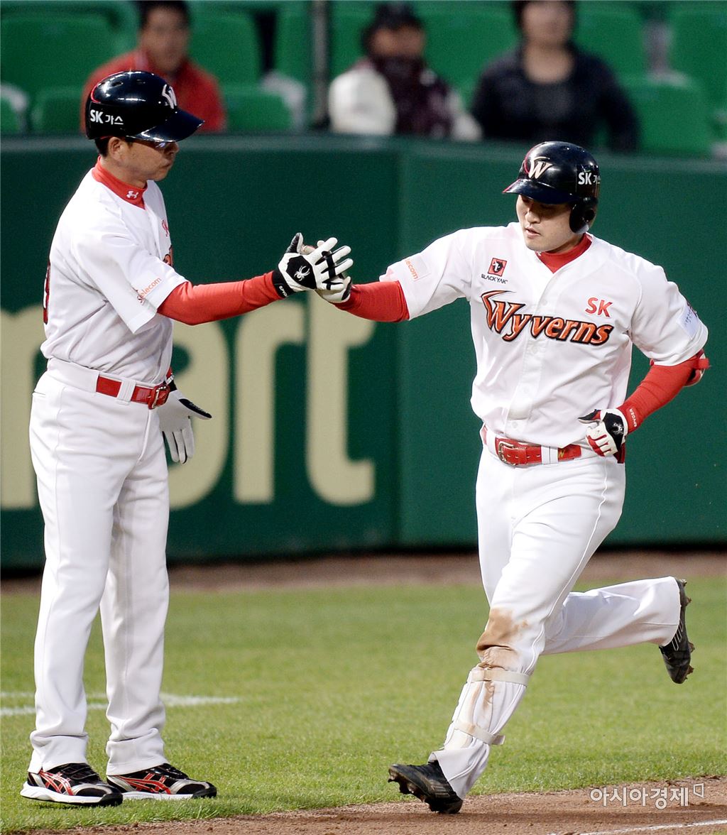 [문학=아시아경제 김현민 기자] 프로야구 넥센 히어로즈와 SK 와이번스의 2016 KBO리그 경기가 19일 인천 문학구장에서 열렸다. 3회말 2사에서 SK 김성현이 넥센 선발 피어밴드를 상대로 좌월 선제 솔로홈런을 치고 김인호 코치와 하이파이브하고 있다. 김현민 기자 kimhyun81@asiae.co.kr<ⓒ세계를 보는 창 경제를 보는 눈, 아시아경제(www.asiae.co.kr) 무단전재 배포금지>