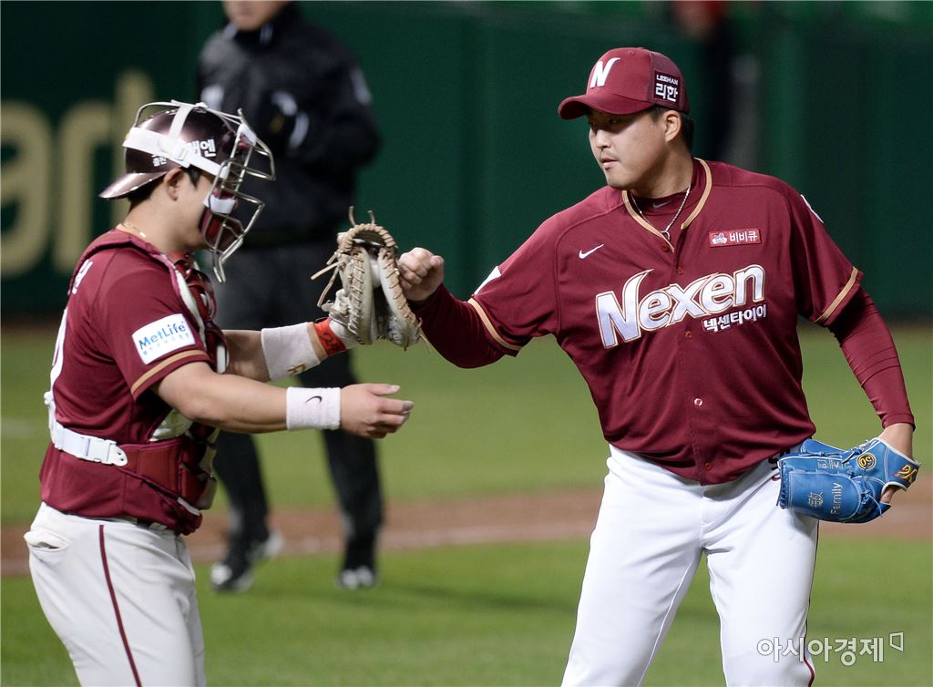 [문학=아시아경제 김현민 기자] 프로야구 넥센 히어로즈와 SK 와이번스의 2016 KBO리그 경기가 19일 인천 문학구장에서 열렸다. 넥센 마무리 김세현이 팀의 3-1 승리를 확정한 뒤 박동원 포수와 하이파이브하고 있다. 김현민 기자 kimhyun81@asiae.co.kr<ⓒ세계를 보는 창 경제를 보는 눈, 아시아경제(www.asiae.co.kr) 무단전재 배포금지>