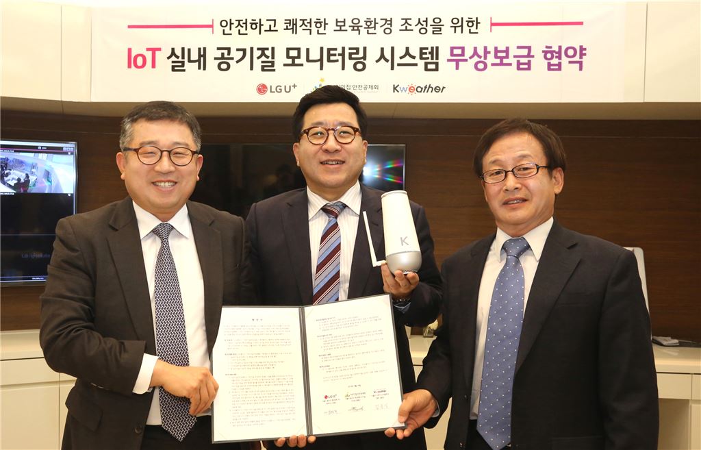 [아시아경제 안하늘 기자] LG유플러스는 쾌적하고 안전한 보육 환경을 조성하기 위해 케이웨더, 어린이집안전공제회와 업무협약식을 맺고 어린이집 등 보육 환경 개선에 나선다고 20일 밝혔다. 이번 업무협약을 통해 LG유플러스는 어린이집안전공제회가 선정한 전국 어린이집 55곳에 케이웨더의 사물인터넷(IoT)기반 실내 공기질 모니터링 장비 '에어가드K LTE'를 보급 및 설치하고 향후 3년간 통신료를 무상 지원키로 했다. '에어가드K LTE'는 자체 탑재된 환경 관측센서를 통해 실내 미세먼지, 온도 및 습도, 이산화탄소, 휘발성유기화합물(VOCs), 소음 등 6가지 실내환경 요소를 측정하는 IoT 장비다. 어린이집 원장, 교사 등은 스마트폰과 PC웹을 통해 실내 공기질 상태를 확인하고 관리할 수 있게 됐다.특히 어린이집 공간 내에서 위험요소가 감지될 경우 '에어가드K LTE'의 환경관측 센서로 들어오는 정보는 LTE망을 통해 클라우드 서버로 보내져 스마트폰으로 알림 메시지가 전송된다. 어린이집 관계자는 알림 메시지를 토대로 공기청정기, 환기장치 등을 가동할 수 있는 행동요령을 받아 즉시 환기를 할 수 있다. 강학주 LG유플러스 사업협력담당 상무는 "IoT 시장선도 사업자로서 LG유플러스만의 IoT 서비스 강점을 기반으로 안전, 에너지절감 등의 사회적 가치를 제공하는 다양한 지원사업을 펼쳐 나갈 것"이라고 강조했다. 김동식 케이웨더㈜ 대표는 "황사, 미세먼지 등 공기오염이 심해지면서 실내 환경도 영향을 받고 있다. 이에 IoT기반 실내 공기질 모니터링 장비가 보육시설 환경 개선에 큰 도움이 될 것"이라고 설명했다. 김기환 어린이집안전공제회 사무총장은 "공제회에서 수행하는 안전관리 컨설팅사업과 연계해 실내 공기질의 중요도가 높은 영아반이 있는 가정ㆍ민간 어린이집을 우선으로 제공 예정"이라며 "이를 통해 실내 보육환경이 보다 쾌적하게 유지ㆍ관리 되기를 기대한다"고 말했다.안하늘 기자 ahn708@asiae.co.kr<ⓒ세계를 보는 창 경제를 보는 눈, 아시아경제(www.asiae.co.kr) 무단전재 배포금지>