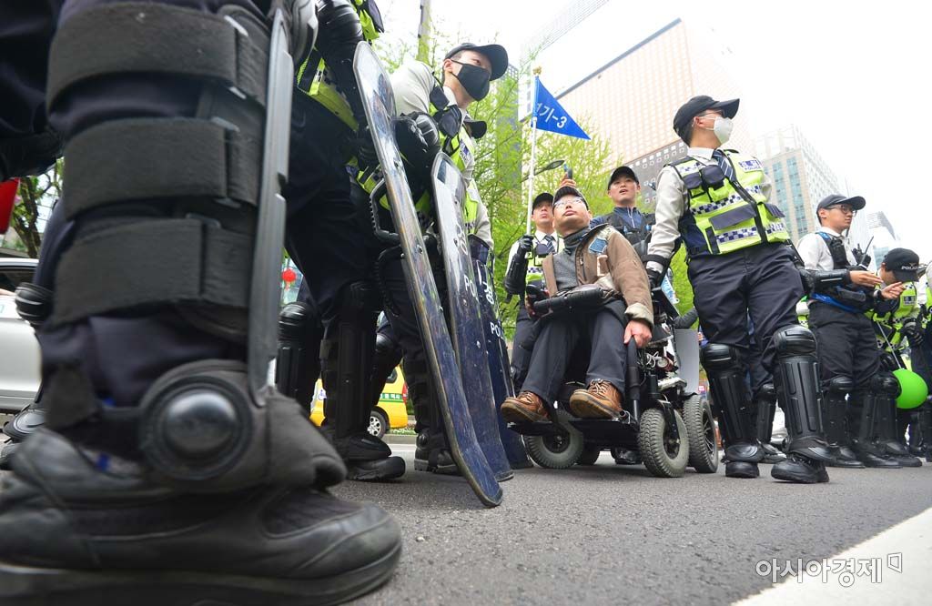 [아시아경제 백소아 기자] 장애인의 날을 맞은 20일 서울 종로구 광화문광장에서 열린 420 장애인차별철폐 투쟁 결의대회를 마친 참가자들이 행진을 하던 중 경찰과 충돌하고 있다.백소아 기자 sharp2046@asiae.co.kr<ⓒ세계를 보는 창 경제를 보는 눈, 아시아경제(www.asiae.co.kr) 무단전재 배포금지>