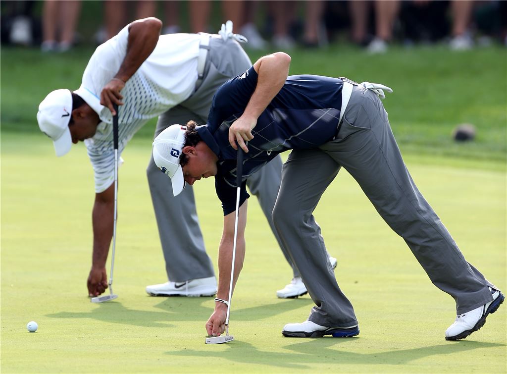 로리 매킬로이(앞)과 타이거 우즈가 그린에서 공이 떨어진 자국을 수리하고 있다.
