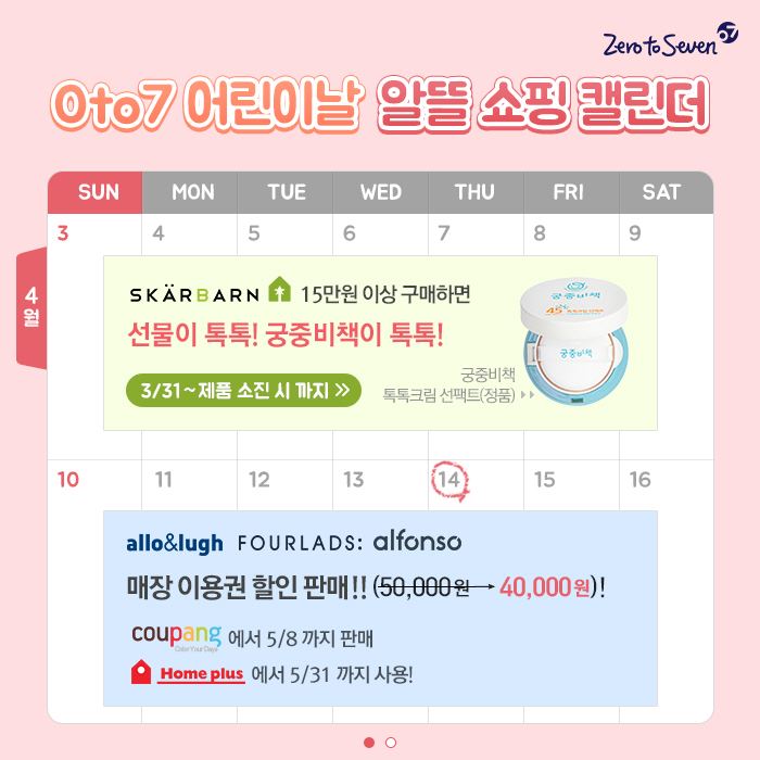 [아시아경제 임혜선 기자]유아동 전문기업 제로투세븐은 자사 카카오스토리와 블로그에서 ‘어린이날 인증샷 이벤트’를 22일부터 한 달 동안 진행한다. 제로투세븐의 온·오프라인 제품을 구매하고 매장사진, 구매영수증, 제품 및 홍보물 등을 촬영한 인증 사진을 소셜네트워크서비스(SNS)에 남기면 백화점상품권 50만원권(1등), 30만원권(2명), 1만원권(3명), 매일유업 ‘우유속에’ 시리즈(100명) 등 푸짐한 경품을 증정한다. 또 자신의 SNS에 ‘#제로투세븐, #제로투기부’, #내생애첫기부’ 중 최소 하나 해시태그를 달면 참여자 수만큼 대한사회복지회에 제로투세븐의 유아동 의류를 기부하는 캠페인도 펼친다. 자녀의류를 온라인 상품교환권으로 보다 스마트하고 저렴하게 구입할 수도 있다. 소셜커머스 사이트 쿠팡에서 5월8일까지 4만원에 판매하는 ‘홈플러스 유아동 매장 이용권’을 구매하면, 전국 홈플러스 매장에서 5만원 상당의 알로앤루, 알퐁소, 포래즈 등의 유아동 의류를 구매할 수 있다. 1만원 상당의 할인 혜택이 주어지는 상품교환권은 5월28일까지 사용 가능하다.임혜선 기자 lhsro@asiae.co.kr<ⓒ세계를 보는 창 경제를 보는 눈, 아시아경제(www.asiae.co.kr) 무단전재 배포금지>