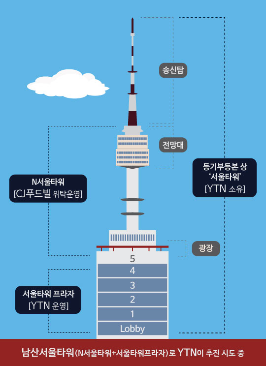 [아시아경제 금보령 수습기자]아이가 부모님에게 "남산타워 가고 싶어요"라고 말한다. 엄마는 "주말에 N서울타워 가서 멋진 야경 볼까?"라고 대답하고, 아빠는 "YTN서울타워에 식당도 많으니까 저녁은 거기서 먹자"라는 얘길 덧붙인다.서울의 랜드마크이자 관광객들이 많이 찾는 서울타워는 그 인기만큼 이름도 다양하다. 사람에 따라 부르기 나름이다. 어떤 이름을 말해도 다들 알아듣지만 진짜 이름이 있을까 싶다. 타워의 등기부등본 상 이름은 '서울타워'다. 등기부등본은 사람의 주민등록등본과 같은 역할을 한다. 부동산에 관한 권리 현황이 적혀 있는 것이다. 법적·행정적 절차에서 등기부등본 상 이름이 쓰인다는 점에서 정식 명칭이다. 사람으로 치자면 본명이라고 볼 수 있다. 서울타워란 이름이 서류에 적혀 있지만 이름이 여러 가지인 데에는 속사정이 있다. 소유자와 일부 공간의 운영자가 다르기 때문이다.'YTN서울타워'는 실제 소유주인 방송사 YTN의 이름을 붙인 것이다. YTN 기자는 방송에서 'YTN서울타워'라는 표현을 사용한다. 서울시나 정부기관이 소유자일 것이라고 생각한 이들에게는 놀랄 만한 사실이다. 주식회사와이티엔은 2000년에 체신공제조합으로부터 서울타워를 인수했다. 체신공제조합은 정보통신을 담당하던 행정기관 체신부의 산하기관이었다.'남산서울타워'라는 이름도 있다. 검색창에 서울타워를 입력하면 나오는 홈페이지 이름 중 하나다. 홈페이지에 들어가면 '남산서울타워는 40년 만에 일반인에게 공개되는 서울타워플라자와 2005년부터 CJ푸드빌이 임대하여 운영 중인 N서울타워로 구성되어 있습니다'라는 설명이 있다. 서울타워플라자는 2013년 아날로그방송이 종료된 후 방송사 직원들이 상주하던 공간을 개발한 곳이다. 지난해 12월 문을 열어 현재 여러 가지 외식업체들이 입점한 상태다. 운영은 물론 YTN이 담당한다.이쯤 되면 'N서울타워'는 어디서 나왔는지 궁금해진다. 온라인 상에는 YTN서울타워에서 Y와 T를 빼고 만든 이름이 아니냐는 추측이 존재하지만 틀린 얘기다. 'N서울타워'는 2005년부터 서울타워 일부를 위탁운영하는 CJ푸드빌이 만들어서 홍보하는 이름이다. 새롭다는 의미의 영어단어 NEW와 Namsan(남산)의 앞글자를 딴 N을 서울타워 앞에 넣었다. 서울타워 일부가 어딘지 묻는 질문에 CJ푸드빌 관계자는 "위로 솟아 있는 부분이라고 생각하면 된다"고 말했다. 서울타워 전망대와 광장 일부를 뜻한다.