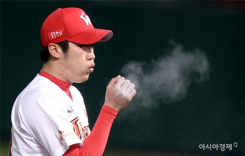[문학=아시아경제 김현민 기자] 프로야구 넥센 히어로즈와 SK 와이번스의 2016 KBO리그 경기가 21일 인천 문학구장에서 열렸다. SK 선발투수 박종훈이 3회초 2사 만루의 위기에서 손에 묻은 로진을 불고 있다. 김현민 기자 kimhyun81@asiae.co.kr<ⓒ세계를 보는 창 경제를 보는 눈, 아시아경제(www.asiae.co.kr) 무단전재 배포금지>
