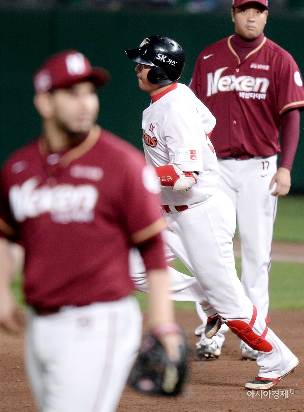[문학=아시아경제 김현민 기자] 프로야구 넥센 히어로즈와 SK 와이번스의 2016 KBO리그 경기가 21일 인천 문학구장에서 열렸다. 4회말 SK 선두타자 최정이 넥센 선발 코엘로를 상대로 동점 솔로홈런을 치고 베이스를 돌고 있다. 김현민 기자 kimhyun81@asiae.co.kr<ⓒ세계를 보는 창 경제를 보는 눈, 아시아경제(www.asiae.co.kr) 무단전재 배포금지>