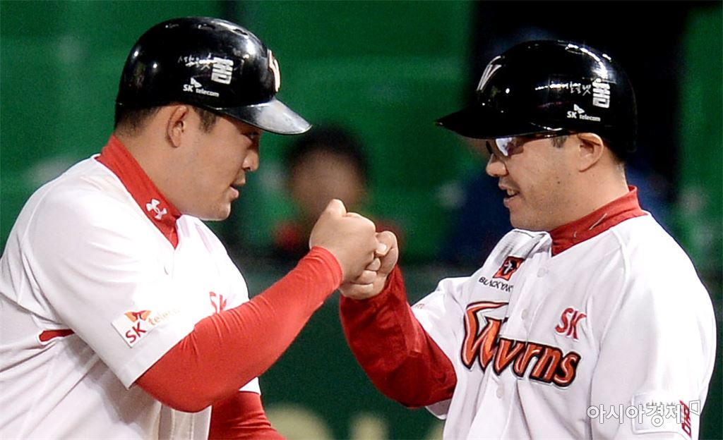[문학=아시아경제 김현민 기자] 프로야구 넥센 히어로즈와 SK 와이번스의 2016 KBO리그 경기가 21일 인천 문학구장에서 열렸다. 4회말 무사에서 SK 정의윤이 우전 안타를 치고 출루한 뒤 박진만 코치와 하이파이브하고 있다. 김현민 기자 kimhyun81@asiae.co.kr<ⓒ세계를 보는 창 경제를 보는 눈, 아시아경제(www.asiae.co.kr) 무단전재 배포금지>