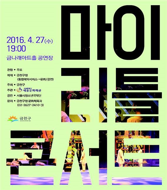 [아시아경제 박종일 기자] 금천구(구청장 차성수)는 27일 오후 7시 금나래아트홀 공연장에서 세종문화회관 연계공연인 퓨전국악 콘서트 ‘마이리틀콘서트’를 선보인다.이번 공연은 구민들에게 문화향유 기회를 제공하고 우리 전통음악의 아름다움과 가치에 대한 공감대를 형성하기 위해 마련됐다. 연주는 국악을 전공하고 있는 30세 이하의 젊은 연주인들로 구성된 ‘서울시청소년국악단’이 맡는다.마이리틀콘서트에서는 일곱 가지의 아리랑을 하나로 묶어 아카펠라로 구성한 곡인 ‘어울아리랑’, 2002년 부산 아시안 게임의 공식 주제가로도 사용됐던 ‘프론티어’를 연주한다.