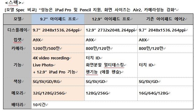 [아시아경제 안하늘 기자] KT는 애플의 태블릿 아이패드 프로 9.7의 예약 판매를 22일부터 오는 28일까지 온라인 공식 채널인 올레샵에서 진행한다고 밝혔다. 아이패드 프로 9.7은 아이패드 프로 12.9의 핵심 기능인 '애플 펜슬'을 지원하며, 아이폰 6S급의 1200만/500만 화소 카메라 성능을 갖췄다.KT는 아이패드 프로 9.7 예약 판매 가입 고객을 위한 다양한 혜택을 제공한다. 선착순 500명에게는 블루투스 이어폰과 아이패드 프로 9.7 전용 필름을 증정한다. 예약 판매 가입자 전원에게는 아이패드 프로 9.7 전용 케이스를 준다. 또 기존 패드 사용자들의 기기변경 부담을 덜어주기 위해 4월 27일부터 중고 보상 정책을 강화해 진행한다. A급 기준으로 전보다 보상 금액이 1만원 늘었다. KT는 안심 차단 데이터 요금제인 '순 데이터(LTE) 요금제'와 스마트폰과 데이터를 나눠 쓸 수 있는 'LTE-데이터쉐어링 요금제'도 운영 중이다.KT에 따르면 아직 출고가는 정해지지 않았다. 애플 코리아 공식 홈페이지에서는 아이패드 9.7의 32기가바이트(GB)모델 공기계 가격은 91만원, 128GB 모델은 111만원, 256GB 모델은 131만원으로 소개돼있다.KT 관계자는 "출고가는 애플과 협의 중에 있고, 출시 직전에 공개될 것"이라며 "공기계 가격에서 대략 5만원 정도 낮은 가격으로 출시될 전망"이라고 말했다.