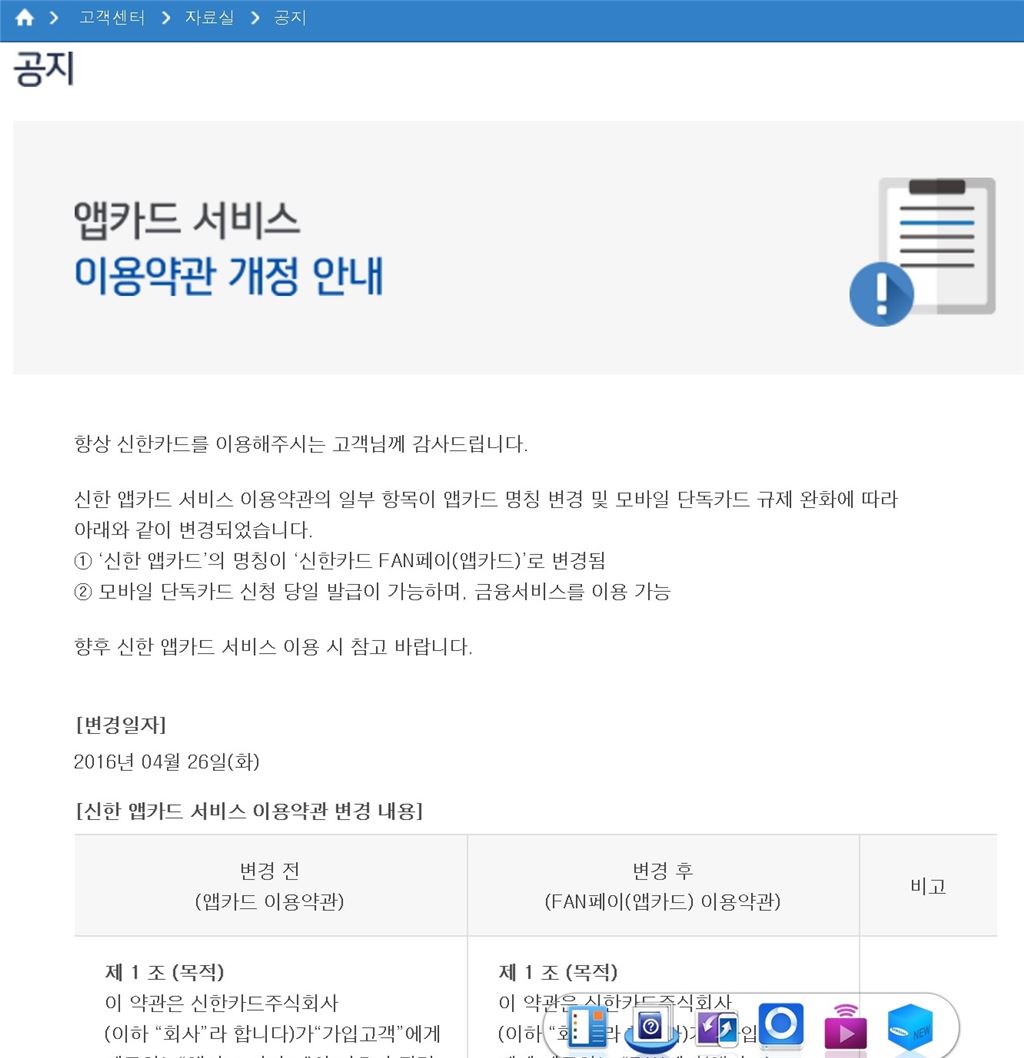 신한카드가 20일 홈페이지 공지사항란에 올린 '앱카드 서비스 이용약관 개정 안내' 내용 (캡쳐화면)