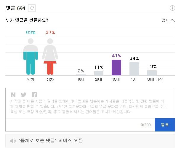 [아시아경제 한진주 기자] 네이버가 기사에 댓글을 단 이용자들의 성별과 연령대 비율을 그래프로 보여준다.22일 네이버(NAVER)는 기사별로 이용자들의 성·연령대별 비율을 보여주는 '통계로 보는 댓글' 서비스를 시작한다고 밝혔다.통계로 보는 댓글은 일정 개수 이상의 댓글이 게재된 네이버 뉴스 기사에 대해 통계 그래프를 제공한다. 네이버 뉴스에서 제공하는 모든 기사에 동일하게 적용되며, 통계 그래프는 기사 하단의 댓글 영역에서 확인할 수 있다.이용자들은 자신과 유사하거나 다른 이용자들이 특정 주제나 기사에 대해 얼마나 많은 관심을 가지는지 파악할 수 있다. 특히 언론 관계자들은 특정 주제에 대한 이용자들의 관심사나 트렌드를 분석하고, 특정 이용자들에게 적합한 기사를 작성하는데 참고할 수 있다. 통계 데이터로 집계되는 정보는 네이버 아이디로 로그인 후 뉴스에 댓글을 게재한 이용자들의 생년월일과 성별 정보로 한정되며, 특정 개인에 대한 정보를 수집하지 않는다. 네이버 측은 "앞으로도 뉴스 이용자들이 보다 편리하게 이용할 수 있도록, 다양한 부가 기능을 추가하는 등 서비스를 개선해나갈 것"이라고 말했다.한진주 기자 truepearl@asiae.co.kr<ⓒ세계를 보는 창 경제를 보는 눈, 아시아경제(www.asiae.co.kr) 무단전재 배포금지>