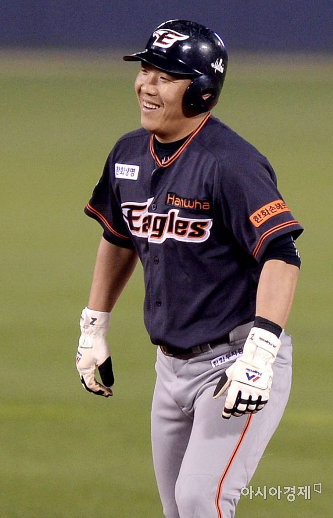 [잠실=아시아경제 김현민 기자] 프로야구 한화 이글스와 두산 베어스의 2016 KBO리그 경기가 22일 잠실구장에서 열렸다. 5회초 2사 2루에서 한화 정근우가 선취 1타점 2루타를 치고 출루한 뒤 미소짓고 있다. 김현민 기자 kimhyun81@asiae.co.kr<ⓒ세계를 보는 창 경제를 보는 눈, 아시아경제(www.asiae.co.kr) 무단전재 배포금지>