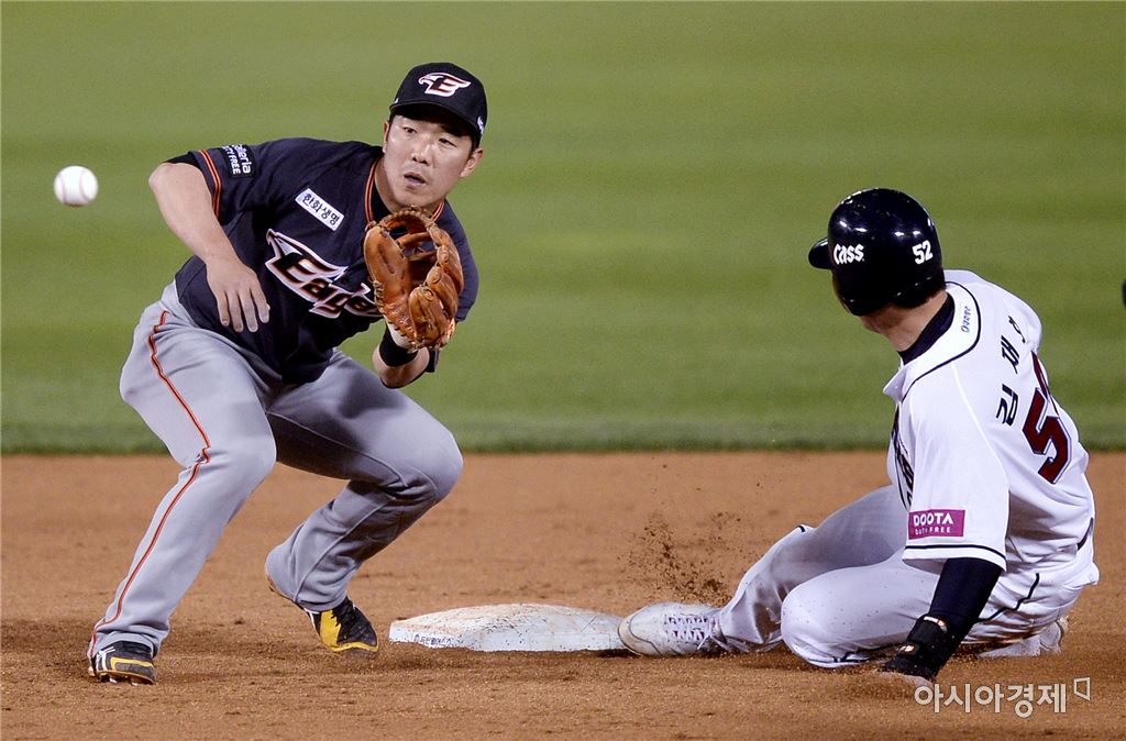[잠실=아시아경제 김현민 기자] 프로야구 한화 이글스와 두산 베어스의 2016 KBO리그 경기가 22일 잠실구장에서 열렸다. 5회말 1사 1루에서 두산 허경민 타석 때 1루주자 김재호가 도루에 성공하고 있다. 한화 2루수는 정근우.김현민 기자 kimhyun81@asiae.co.kr<ⓒ세계를 보는 창 경제를 보는 눈, 아시아경제(www.asiae.co.kr) 무단전재 배포금지>