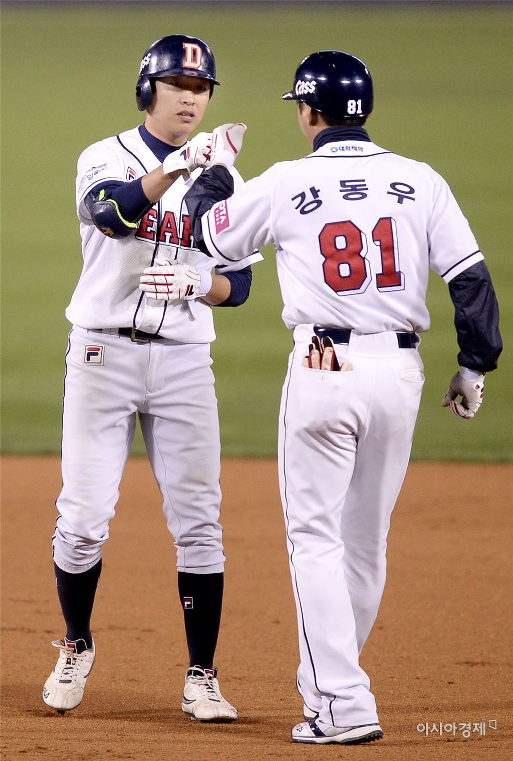 [잠실=아시아경제 김현민 기자] 프로야구 한화 이글스와 두산 베어스의 2016 KBO리그 경기가 22일 잠실구장에서 열렸다. 7회말 1사 1,3루에서 두산 정수빈이 추가 1타점 2루타를 치고 강동우 코치와 하이파이브하고 있다.김현민 기자 kimhyun81@asiae.co.kr<ⓒ세계를 보는 창 경제를 보는 눈, 아시아경제(www.asiae.co.kr) 무단전재 배포금지>