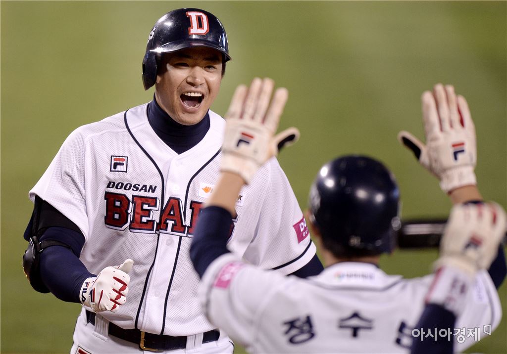 [잠실=아시아경제 김현민 기자] 프로야구 한화 이글스와 두산 베어스의 2016 KBO리그 경기가 22일 잠실구장에서 열렸다. 7회말 무사 만루에서 두산 대타 김재환이 한화 이재우를 상대로 우월 만루 홈런을 치고 선행주자들과 기뻐하고 있다.김현민 기자 kimhyun81@asiae.co.kr<ⓒ세계를 보는 창 경제를 보는 눈, 아시아경제(www.asiae.co.kr) 무단전재 배포금지>