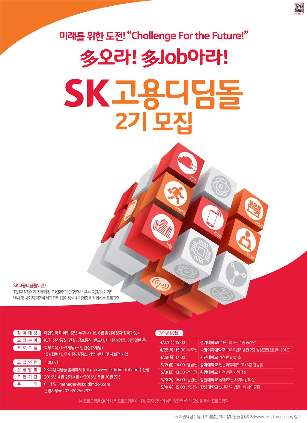 [아시아경제 심나영 기자]SK그룹은 24일 청년 고용 확대를 위해 도입한 인재채용 지원 프로그램인 ‘고용 디딤돌’ 2기지원자를 모집한다고 밝혔다. 지원자격은 만 15세 이상 만 34세 이하의 청년으로 학력 제한 없이 누구나 참여할 수 있다. 희망자는 다음달 10일까지 SK고용디딤돌 홈페이지를 통해 지원서를 접수하면 된다. 서류 및 면접전형을 거쳐 선발될 최종 합격자는 6월 중순쯤 발표될 예정이다. 모집 규모는 1000명이다. 고용디딤돌은 SK가 청년 구직자에게 직무교육과 인턴십 기회를 제공, 취업 경쟁력을 높여 중소기업 등에 취업할 수 있도록 지원하는 프로그램이다. SK는 지난 1월 디딤돌 1기생을 선발한 뒤 직무교육과 인턴십 기회를 제공하고 있다. 직무교육은 기본소양과 기업이해 등 직무공통 과정과 직무에 따라 17개 코스로 나눠진 전문 과정으로 1~3개월간 진행된다. 직무교육을 마친 뒤에는 디딤돌 프로그램에 참여한 중소기업에서 3개월간 인턴으로 근무하면서 실무경험을 쌓을 수 있는 기회를 제공한다. SK는 디딤돌 2기지원자가 다양한 업종에서 양질의 인턴 기회를 제공받을 수 있도록 참여업체를 대폭 늘렸다. 디딤돌 2기에는 정보통신과 반도체, 에너지·화학, 전기전자, 건설 분야의 SK협력사와 중소기업 등 450여개 업체가 참여할 예정이다. 디딤돌 1기 300여개 업체에 비해 50%가 증가했다. SK관계자는 “디딤돌 1기 프로그램 시행 이후 인턴 사원을 요청하는 중소업체들의 요구가 많아져 지원자의 선택의 폭을 넓히고 중소업체의 구인난을 해결할 수 있는 기회를 제공하고자 참여업체를 확대했다”고 밝혔다. 디딤돌 2기 지원자로 선발되면 오는 7월부터 직무교육과 인턴십 프로그램을 이수하게 된다. 프로그램은 4~6개월간 진행되며 5개월 과정을 수료했을 경우 훈련비와 인턴급여, 취업지원금 명목으로 750만원을 지원받는다. 인턴 근무가 종료된 후에는 참여 회사 사정에 따라 정규직으로 전환될 기회도 갖게 된다.SK인재육성위원회 조돈현 기업문화팀장(부사장)은 “SK 고용디딤돌 프로그램이 구직자에게는 취업의 기회를, 중소기업에게는 우수인재를 확보하는 프로그램이 되고 있다”면서“이 프로그램을 통해 대중소기업 상생의 토대가 더 강화되기를 바란다”고 말했다. 심나영 기자 sny@asiae.co.kr<ⓒ세계를 보는 창 경제를 보는 눈, 아시아경제(www.asiae.co.kr) 무단전재 배포금지>