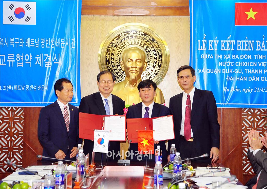 광주시 북구(청장 송광운)와 베트남 꽝빈성 바돈시(인민위원회 위원장 팜 꽝 롱)는 지난 22일 바돈시 인민위원회 청사 대회의실에서 양 도시 간 우호교류 협약을 체결하고, 송광운 북구청장(왼족 두 번째), 심재섭 광주 북구의회의장(맨 왼쪽 ), 팜 꽝 롱 바돈시 인민위원회 위원장(왼쪽 세 번째), 짠 탕 바돈시 공산당 서기(맨 오른쪽)와 함께 기념촬영을 하고 있다. 사진제공=광주시 북구