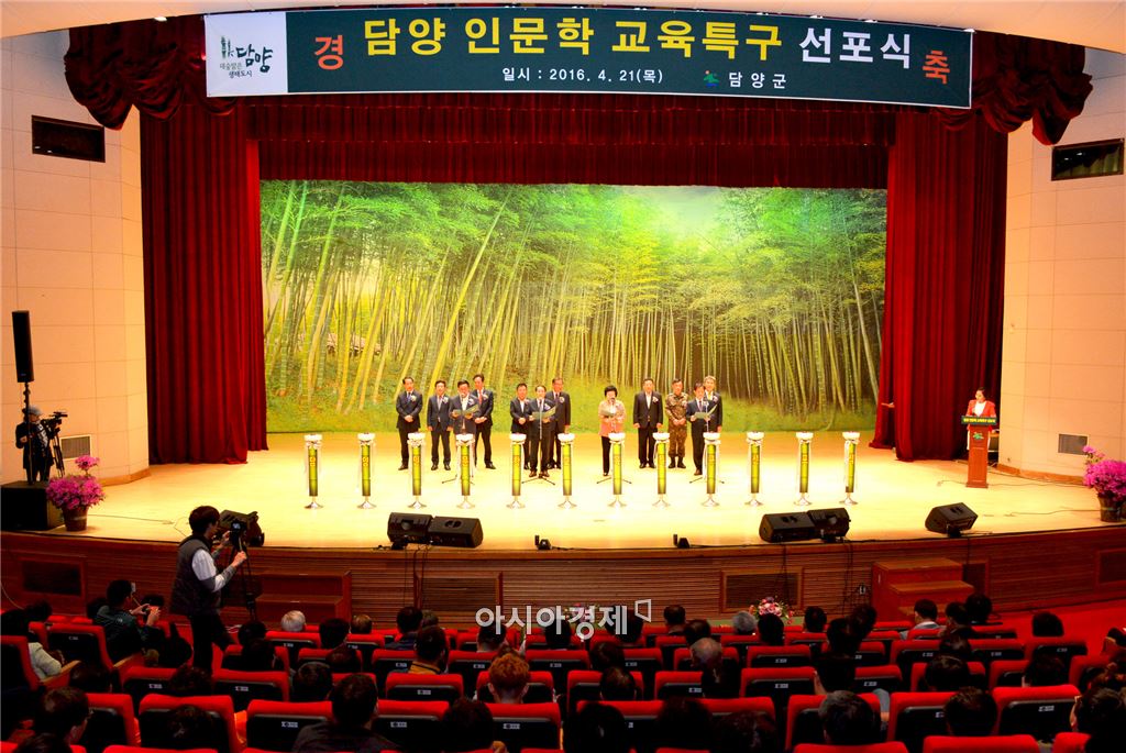21일 '담양 인문학 교육특구 지정 선포식 개최'[아시아경제 문승용] 담양군이 지난달 인문학 교육특구로 공식적으로 지정됨에 따라 군은 범군민적 참여를 바탕으로 한 ‘인문학 공감의 장’을 마련하기 위해 지난 21일 내·외빈과 유관기관, 군민 등 800여명이 참석한 가운데 인문학 교육특구 선포식을 진행했다.이날 선포식은 최형식 담양군수를 비롯해 이개호 국회의원, 박철홍·전청철 도의원, 윤영선 의장 외 군의원, 김왕복 전남도립대학 총장, 공영휴 담양교육지원청 교육장, 김도연 담양소방서장, 담양군 초·중·고 교장 및 사회단체장들이 내·외빈으로 참석해 자리를 빛냈으며 축하공연, 특구추진 경과보고, 선언문 낭독, 인문학 강의 순으로 진행됐다.군은 이번 선포식을 시작으로 오는 2020년까지 역사와 문화, 자연과 정원을 활용한 인문학 문화 콘텐츠 및 다양한 문화체험 및 교육 프로그램을 개발·운영함으로써 사람과 자연, 교육이 어우러진 인문학 생태도시를 조성해 나갈 계획이다.또한 비교우위를 점하고 있는 가사문학, 대나무, 문화, 역사 등의 지역 자원을 연계한 인문학 콘텐츠 개발을 통해 담양을 ‘인문학 기행지’로 발전시키고 문화, 예술, 관광 산업을 융·복합화해 지역 발전의 시너지 효과를 창출할 방침이다.한편, 이날 대한민국 평생교육진흥재단 대표 겸 아주대학교 교수로 재직 중인 최운실 강사의 ‘천년 담양 인문학을 만나다’를 주제로 한 인문학 강의는 담양 인문학 교육 특구 지정 선포식의 의미를 한층 더 고조시키며 담양군민들의 자긍심을 새삼 일깨우는 등 뜻 깊은 시간으로 채워졌다.군 관계자는 “군민들의 성원에 힘입어 담양이 국내 최초로 인문학 교육특구로 지정되는 쾌거를 이뤘다“며 ”‘국내 최초 인문학 교육특구’라는 이름에 걸맞은 인문학 중심 도시로의 도약을 위해 착실한 준비를 해나가겠다“고 말했다.문승용 편집국부장 msynews@<ⓒ세계를 보는 창 경제를 보는 눈, 아시아경제(www.asiae.co.kr) 무단전재 배포금지>
