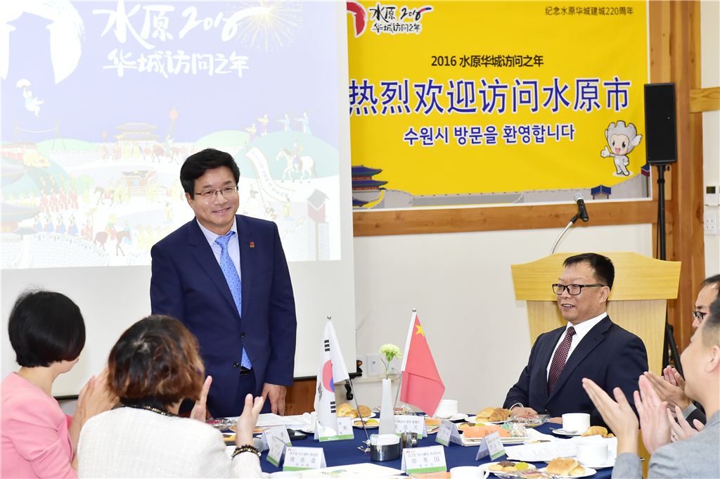 염태영 수원시장이 중국에서 수원을 찾은 국영방송, 신문, 잡지, 여행사 관계자들과 이야기를 나누고 있다.