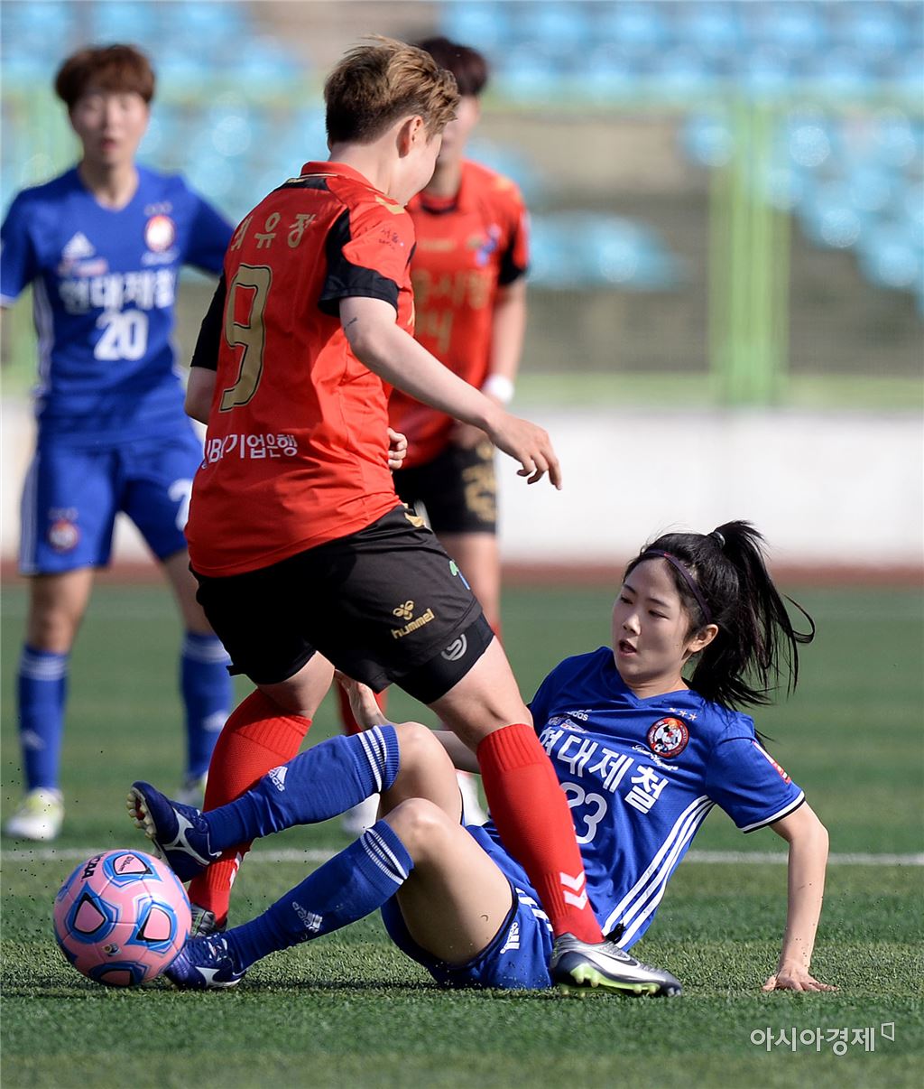 [효창=아시아경제 김현민 기자] 여자축구 2016 WK리그 서울시청과 인천현대제철의 경기가 25일 서울 효창운동장에서 열렸다. 현대제철 이민아가 상대 최유정의 공격을 태클로 막아내고 있다. 김현민 기자 kimhyun81@asiae.co.kr<ⓒ세계를 보는 창 경제를 보는 눈, 아시아경제(www.asiae.co.kr) 무단전재 배포금지>