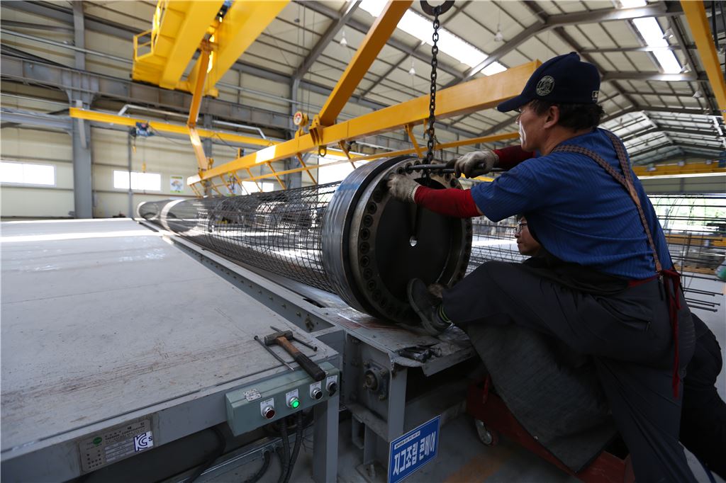충남 아산에 위치한 아주산업 아산사업소에서 근로자가 고강도 콘크리트파일(PHC파일)을 만들고 있다.