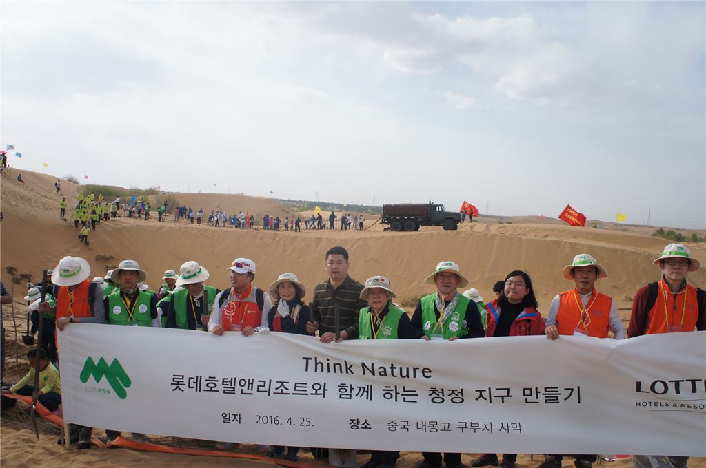 지난 25일 중국 내몽고 쿠부치 사막에서 남재섭 커뮤니케이션 부문장(오른쪽에서 두번째)과 권병현 미래숲 회장(오른쪽에서 다섯번째)을 비롯한 롯데호텔 임직원과 미래숲 관계자들이 기념촬영을 하고 있다.