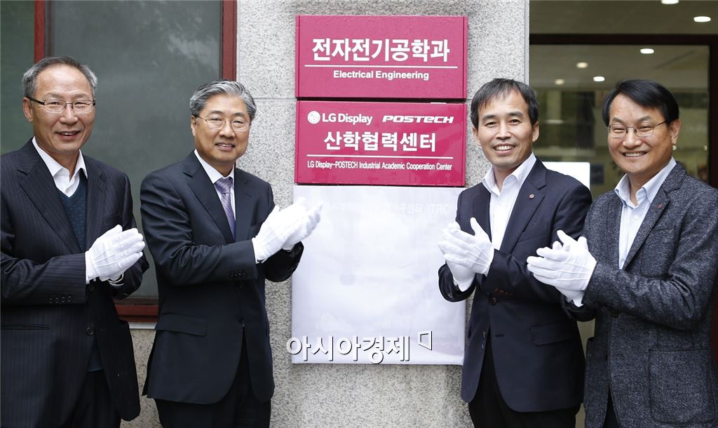 ▲LG디스플레이가 포항공대 LG연구동에 'LG디스플레이-포스텍 산학협력센터'를 설립했다. 강인병 LG디스플레이 CTO 전무(사진 오른쪽에서 두 번째)와 정완균 포스텍 산학협력단장(사진 왼쪽에서 두 번째)등이 센터 현판식에 참여하고 있다. (제공=LG디스플레이)<br />