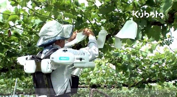 일본의 한 농민이 백팩처럼 걸치면 별로 힘들이지 않고 과일ㆍ채소의 수확ㆍ운반이 가능하도록 도와주는 기계 '라쿠 베스트'를 지고 작업 중이다(사진=구보타).