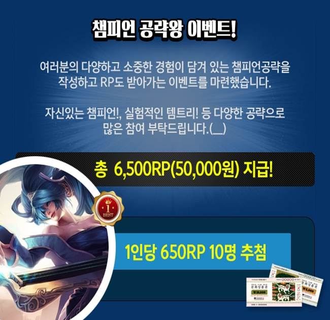 [아시아경제 온라인이슈팀] 라이엇게임즈에서 서비스하는 글로벌 인기 팀 대전 게임 ‘리그오브레전드(롤)’가 지난 26일 공식 홈페이지를 통해 '갈리오'와 '티모', '빅토르', '다이애나' 총 4종의 챔피언을 세일한다고 밝혀 유저들의 이목이 집중된 가운데유저 커뮤니티 '리그오브레전드 헝그리앱'에서는 유저들이 챔피언을 더욱 쉽게 이용할 수 있도록 리그오브레전드 RP(게임 캐시)를 지급하는 챔피언 공략 이벤트를 진행하고 있다.이번 이벤트는 '챔피언 공략왕 이벤트!'로 '리그오브레전드 헝그리앱' 커뮤니티에 이벤트 기간 동안 자신이 평소에 자주 사용하거나 요즘 뜨고 있는 챔피언에 대한 공략을 작성하면 추첨을 통해 총 6천5백 RP를 지급한다. 본 이벤트는 5월 5일까지 진행하며 자세한 내용은 '리그오브레전드 헝그리앱' 커뮤니티 이벤트 공지를 통해 확인할 수 있다.