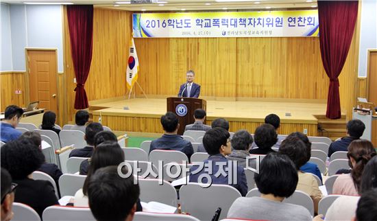 전라남도곡성교육지원청(교육장 박찬주)은 27일 관내 초?중?고 학교폭력대책자치위원 110여명이 참석한 가운데 학교폭력예방을 위한 연찬회를 실시했다. <br />