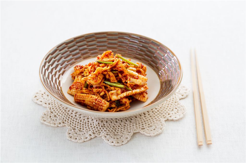 주재료(2인분)오징어 1마리, 소금 약간, 무말랭이 30g, 실파 5뿌리양념장 재료고춧가루 2, 액젓 1, 물엿 1, 설탕 0.3, 맛술 1, 다진 마늘 1 참기름 1, 깨소금 0.5 만들기▶ 요리 시간 25분1. 오징어는 껍질을 벗겨 안쪽에 칼집을 내어 채 썰어 끓는 물에 소금을 약간 넣고 데쳐 물기를 뺀다.