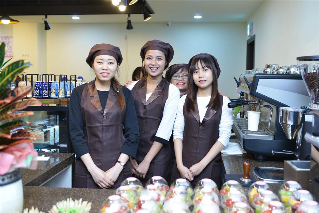 다문화카페 ‘꿈, 아시아!’에서 일하는 다문화 여성 바리스타들이 카페 안에서 기념사진을 찍고 있다. 한남대 제공