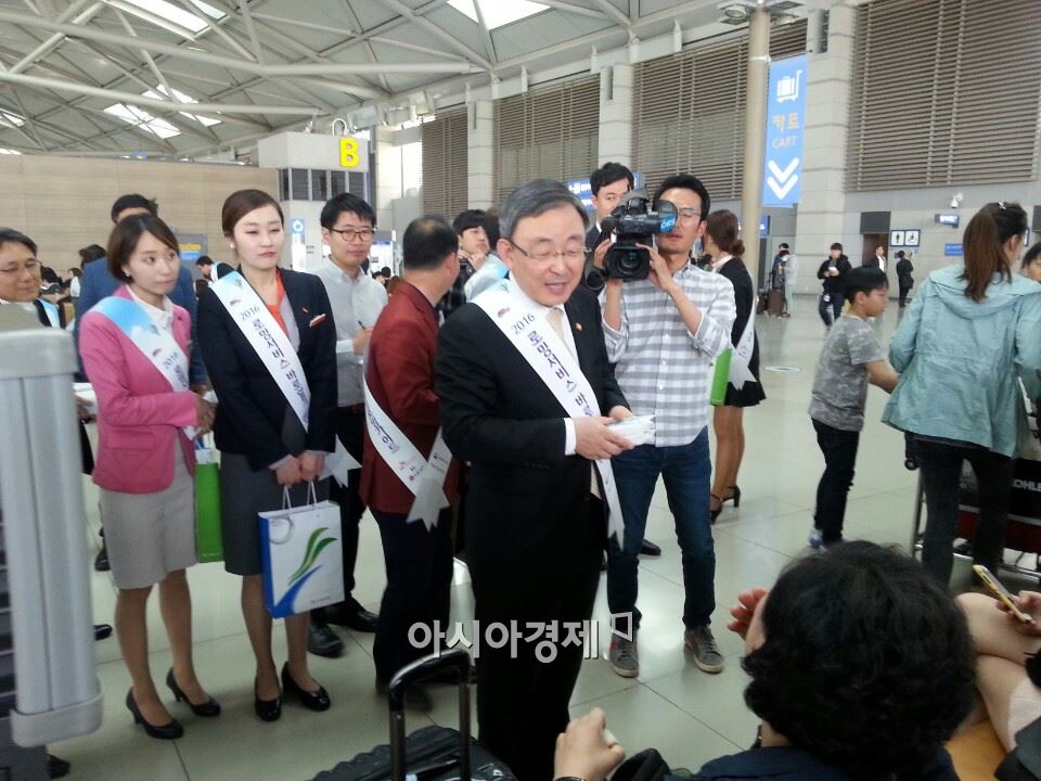방송통신위원회는 28일 인천국제공항에서 이동통신 3사, 알뜰폰 사업자 및 한국정보통신진흥협회(KAIT) 등과 함께 해외에서 스마트폰을 안심하고, 알뜰하게 이용할 수 있는 방법을 안내하는 캠페인을 전개했다. 최성준 방송통신위원장(가운데)이 이날 인천국제공항을 찾아 시민들에게 해외 데이터로밍 서비스에 대해 설명하고 있다. <br />
