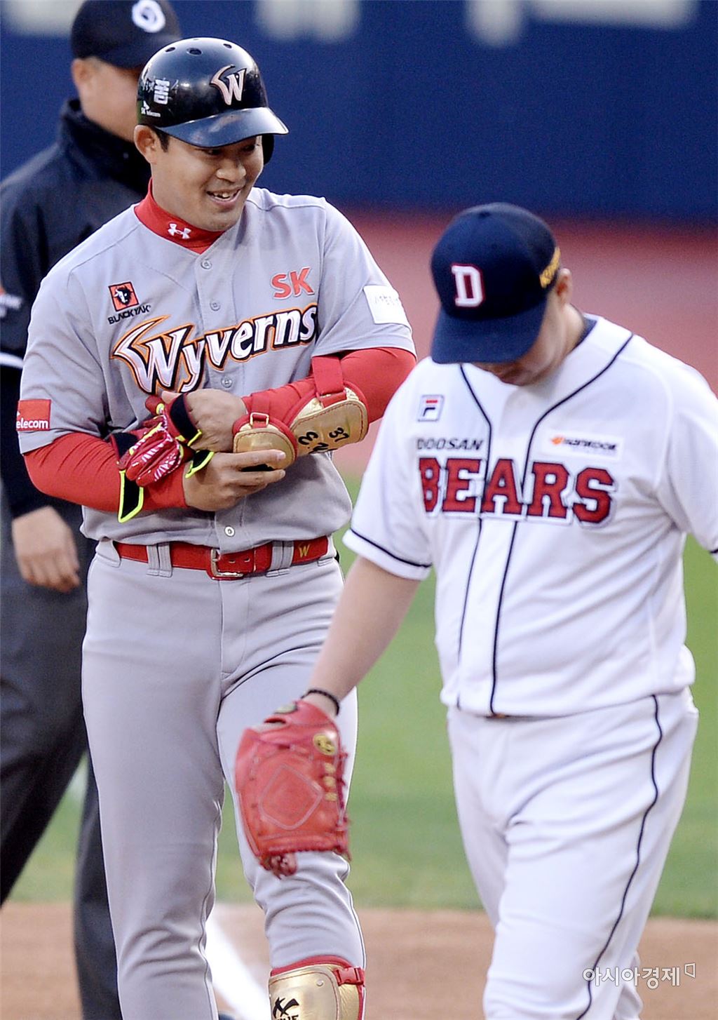 [잠실=아시아경제 김현민 기자] 프로야구 SK 와이번스와 두산 베어스의 2016 KBO리그 경기가 28일 잠실구장에서 열렸다. 1회초 2사 2루에서 SK 정의윤이 선취 1타점을 치고 출루한 뒤 미소짓고 있다. 오른쪽은 두산 선발 유희관.김현민 기자 kimhyun81@asiae.co.kr<ⓒ세계를 보는 창 경제를 보는 눈, 아시아경제(www.asiae.co.kr) 무단전재 배포금지>