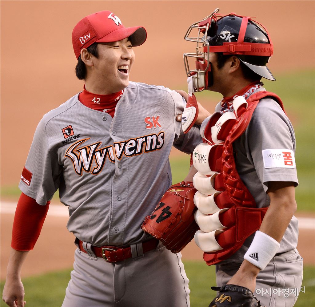 [잠실=아시아경제 김현민 기자] 프로야구 SK 와이번스와 두산 베어스의 2016 KBO리그 경기가 28일 잠실구장에서 열렸다. SK 선발 문승원이 1회말 수비를 3자범퇴로 막은 뒤 김민식 포수와 미소짓고 있다.김현민 기자 kimhyun81@asiae.co.kr<ⓒ세계를 보는 창 경제를 보는 눈, 아시아경제(www.asiae.co.kr) 무단전재 배포금지>