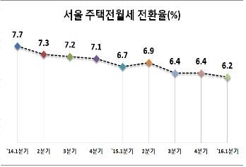 [아시아경제 조은임 기자]서울시의 올해 1분기 반전세 주택 전월세전환율이 6.2%로 조사됐다. 이는 직전분기보다 소폭 하락한 수준으로, 전년동기에 비해선 0.5%포인트 하락한 수치다. 서울시는 29일 서울통계 홈페이지와 서울부동산정보광장에 올해 1분기 전월세전환율 정보를 공개했다. 이는 서울시 전역 동주민센터에서 확정일자를 받은 전월세 계약을 분석한 결과를 토대로 했다. 전월세전환율은 전세 보증금을 월세로 전환할 때 적용하는 이율을 말한다. 주택임대차보호법은 시행령 제9조에서 전월세 전환율 상한선을 기준금리 4배수로 정해두고 있다. 이에 따라 한국은행이 기준금리를 1.5%로 동결한 지난 6월 이후 전월세전환율 상한은 6%여야 하지만 강제 조항은 아니다.자료:서울시
