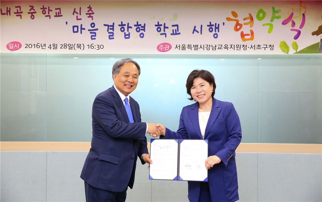 조은희 서초구청장(오른쪽)과 안종복 서울시강남교육지원청 교육장(왼쪽)이 28일 강남교육지원청에서 열린 ‘내곡중학교 신축 마을결합형학교 시행’ MOU 체결식에서 협약서에 서명 후 악수를 나누고 있다.<br />