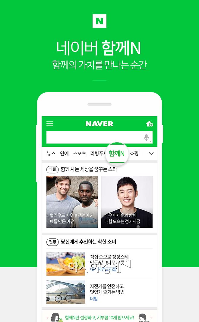 [아시아경제 한진주 기자] 네이버가 모바일 첫화면에서 다양한 공익 단체와 이웃들의 이야기를 전달하는 '함께N' 주제판을 출시한다고 29일 밝혔다.함께N은 최근 사회적기업, 공익단체 등에서 다양한 사회적 활동에 대한 사회적 관심을 환기하고, 많은 이용자들의 참여를 독려하기 위해 마련됐다.함께N에서는 이웃에서 벌어지는 일상의 소소한 이야기부터 사회적기업, 비영리단체, 소셜벤처 등의 최근 소식과 활동현황, 주최 행사 등 다양한 공익 뉴스와 정보를 만날 수 있다.이용자들은 함께N을 통해 펀딩이나 네이버 해피빈 공익단체 기부에 참여하거나 소셜벤처 사업에 동참할 수 있다. 네이버는 함께N 출시를 기념해 오는 5월30일까지 '함께N' 주제판 설정자에게 기부콩 10개를 제공하는 이벤트를 실시한다. 5월 한달 간 공익을 주제로 포스팅할 포스트 에디터도 모집할 예정이다.네이버는 모바일 첫화면에 스몰비즈니스와 콘텐츠 창작자 지원을 위한 주제판 '플레이스'도 출시할 계획이다. 한진주 기자 truepearl@asiae.co.kr<ⓒ세계를 보는 창 경제를 보는 눈, 아시아경제(www.asiae.co.kr) 무단전재 배포금지>