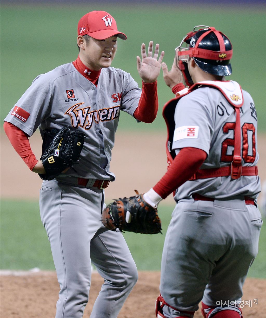 [고척돔=아시아경제 김현민 기자] 프로야구 SK 와이번스와 넥센 히어로즈의 2016 KBO리그 경기가 29일 서울 양천구 고척스카이돔에서 열렸다. SK 마무리 박희수가 팀의 4-3 승리를 확정한 뒤 이재원 포수와 하이파이브하고 있다. 김현민 기자 kimhyun81@asiae.co.kr<ⓒ세계를 보는 창 경제를 보는 눈, 아시아경제(www.asiae.co.kr) 무단전재 배포금지>