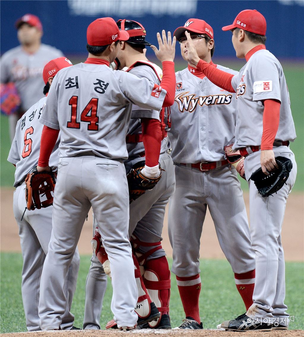 [고척돔=아시아경제 김현민 기자] 프로야구 SK 와이번스와 넥센 히어로즈의 2016 KBO리그 경기가 29일 서울 양천구 고척스카이돔에서 열렸다. SK 선수들이 팀의 4-3 승리를 확정한 뒤 기쁨을 나누고 있다. 김현민 기자 kimhyun81@asiae.co.kr<ⓒ세계를 보는 창 경제를 보는 눈, 아시아경제(www.asiae.co.kr) 무단전재 배포금지>