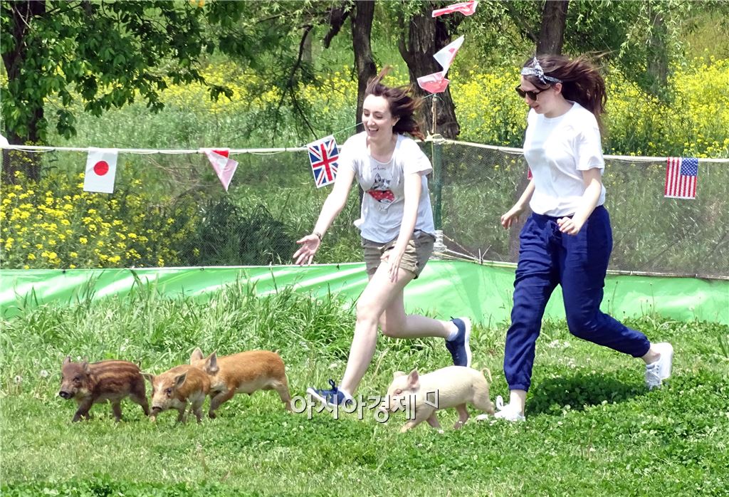 주말인 30일 함평나비대축제가 열리고 있는 함평엑스포공원을 찾은 외국인들이 가축몰이 체험을 하면서 즐거워하고 있다. '나비따라 꽃길따라'라는 주제로 오는 5월 8일까지 함평엑스포공원에서 열린다.