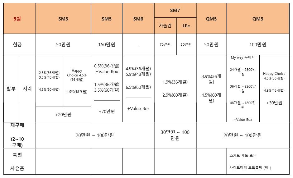 [아시아경제 송화정 기자]르노삼성자동차는 1일 자동차 구매 고객들이 할부원금에 따라 최장 48개월까지 무이자로 할부 구매할 수 있는 '마이 웨이' 무이자 할부 프로그램과 특별 사은품 등의 5월 판매조건을 선보였다.르노삼성은 QM3 구매고객들의 차량구매 부담을 줄여주기 위해 밸류박스와 함께 하는 마이웨이 무이자 할부 프로그램을 진행한다. 마이웨이 무이자 할부 프로그램은 고객이 직접 선납금을 선택하고 남은 할부원금에 따라 최장 48개월까지 무이자로 할부 구매할 수 있는 금융 프로그램이다. 여기에 QM3 구매고객을 위한 특별 사은품으로 스키트 세트나 사이드미러 오토폴딩 용품 중 한 가지를 무료로 선택할 수 있다. QM3 구매고객은 마이웨이 할부 외에도 해피초이스 할부 프로그램을 선택할 수도 있다. 해피초이스 할부를 통해서 4.5%(36개월)와 4.9%(48개월)의 두 가지 저금리 상품 중에 선택이 가능하다. 해피초이스 할부는 선수금 최소 10%~최대 30%, 그리고 유예율 40%~70% 범위 안에서 선택해 월 납입금을 자유롭게 조절할 수 있는 신개념의 할부 프로그램이다. 해피초이스 프로그램으로 QM3를 구매하는 고객에게는 추가로 30만원의 할인 혜택도 제공한다. QM3 현금 구매 시에는 100만원의 할인 혜택이 제공된다.이외에 SM6 구매 고객에게는 신차 구매의 기쁨을 더 오래도록 누릴 수 있도록 해피케어 보증연장 서비스, 신차 교환 보장 프로그램, 스마트 운전자보험을 묶은 밸류박스를 선택할 시에 4.9%(36개월), 5.9%(48개월), 6.5%(60개월) 할부 조건으로 구매가 가능하다. 또한 5월 중 SM5 16MY 모델을 현금으로 구매하면 150만원을 할인해주며 할부로 구매하는 고객들은 밸류박스를 이용해 70만원 할인에 0.5% 초저리 할부(36개월)와 함께 해피케어 보증연장 서비스, 신차 교환 보장 프로그램, 운전자보험 서비스를 모두 누릴 수 있다. SM3는 현금 고객을 대상으로 50만원을 할인해 주며 할부 고객은 2.5%(36개월), 3.5%(48개월), 4.5%(60개월)의 저금리 혜택을 선택할 수 있다. 또한, 해피초이스 할부를 통해 4.5%(36개월)와 4.9%(48개월)의 두 가지 상품 중에 선택해 월 납입금을 자유롭게 조절할 수 있다. SM3 할부 구매 고객에게는 추가로 20만원의 할인 혜택이 제공된다. SM7 고객은 가솔린 모델 70만원, LPG 모델 50만원의 현금 할인 받을 수 있으며 할부 고객은 1.9%(36개월), 2.9%(60개월)의 파격적인 저금리 혜택을 받는다. QM5 고객 역시 50만원 현금 할인 또는 3.9%(36개월)과 4.5%(60개월)의 저금리 혜택을 누릴 수 있다.보다 자세한 내용은 가까운 영업지점이나 르노삼성자동차 고객센터(080-300-3000)를 통해 문의하면 된다.한편 지난 3월 출시한 SM6는 2.0 GDe와 1.6 TCe 모델이 모두 큰 인기를 끌면서 고객 인도까지의 출고 대기기간이 길어지고 있다. 특히, LE, RE 상위 트림에서 S링크 패키지와 드라이빙 어시스트 패키지 등과 같은 고급 옵션의 신청률이 매우 높게 나타났다. 르노삼성은 고객 인도기간을 단축하기 위해 전사적인 역량을 집중하고 있다. 박동훈 르노삼성 대표이사는 "고객들의 넘치는 성원에 힘입어 SM6가 놀라운 판매기록을 만들어가고 있다. SM6는 상위 트림모델의 판매비중이 매우 높으며 대부분의 고객들이 고급 옵션을 필수로 선택하고 있다"면서 이는 SM6가 고객에게 제공하고자 하는 새로운 차원의 고급스러움과 남다른 상품성이 고객들에게 인정 받았다는 것을 보여준다. SM6의 고급 옵션부품과 상위 트림의 수급, 생산에 더욱 박차를 가해 고객 대기기간을 최대한 단축할 수 있도록 노력하고 있다"고 말했다.송화정 기자 pancake@asiae.co.kr<ⓒ세계를 보는 창 경제를 보는 눈, 아시아경제(www.asiae.co.kr) 무단전재 배포금지>