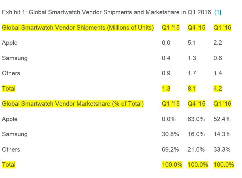 1분기 스마트워치 출하량, 점유율(출처 = Strategy Analytics)