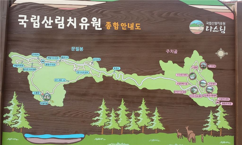 [아시아경제(대전) 정일웅 기자] 세계 최초의 ‘종합산림치유시설’이 올해 새롭게 문을 연다.산림청은 경북 영주시 봉현면 테라피로에 ‘국립산림치유원 다스림(이하 치유원)’을 조성, 오는 8월부터 방문자들을 맞이할 계획이라고 2일 밝혔다.기존 국립자연휴양림의 개념에 ‘치유’의 개념을 덧입힌 이 공간은 건강증진센터와 산림치유마을, 연구센터, 치유 숲길 등을 조성하고 산림치유프로그램을 도입·적용한 신개념의 산림복지 공간으로 기획·마련된다.치유센터 초입에 마련된 홍보관에서 치유원 내방자들이 홍보영상을 관람하고 있다. 국립산림치유원 다스림 제공